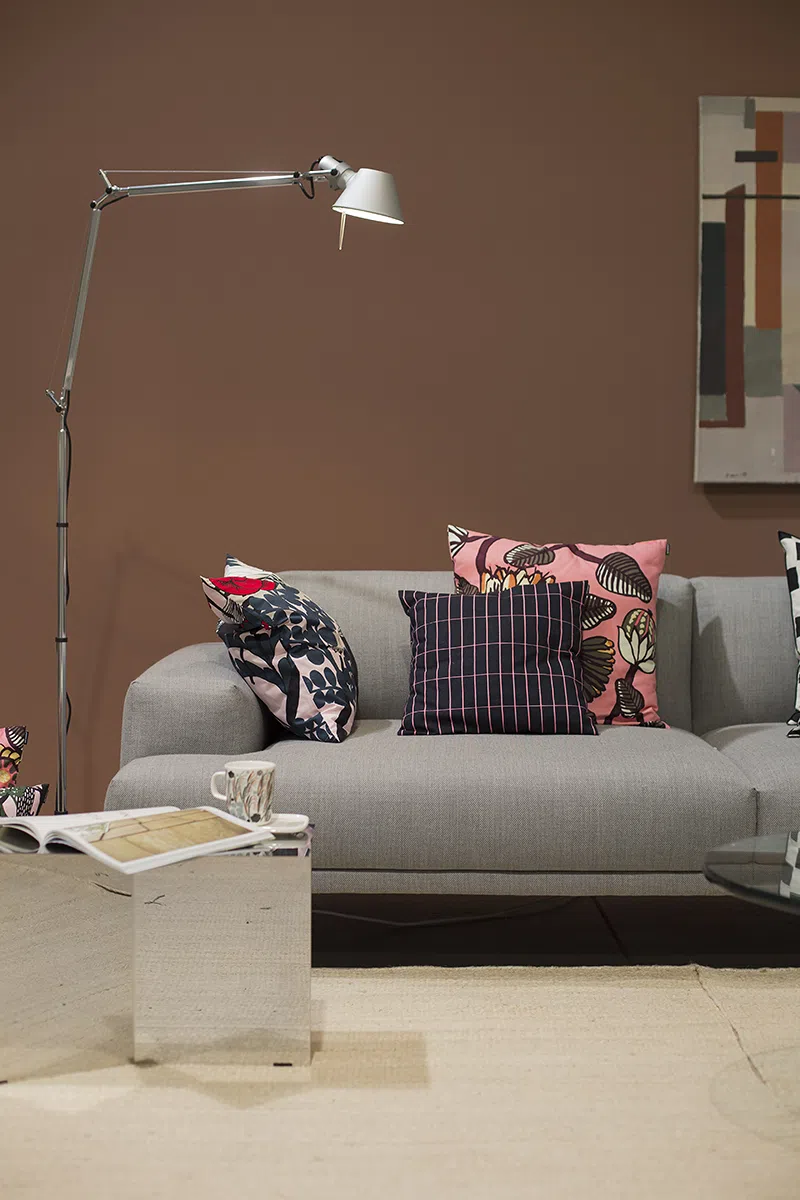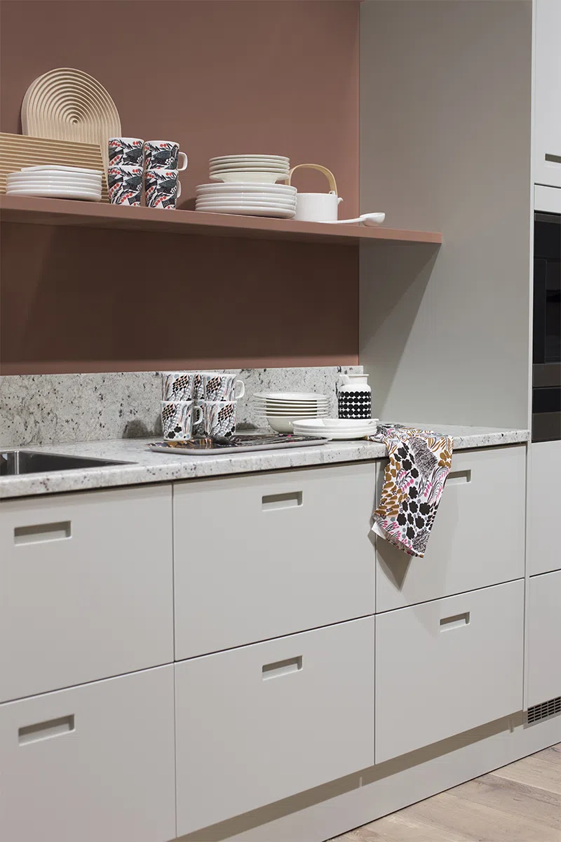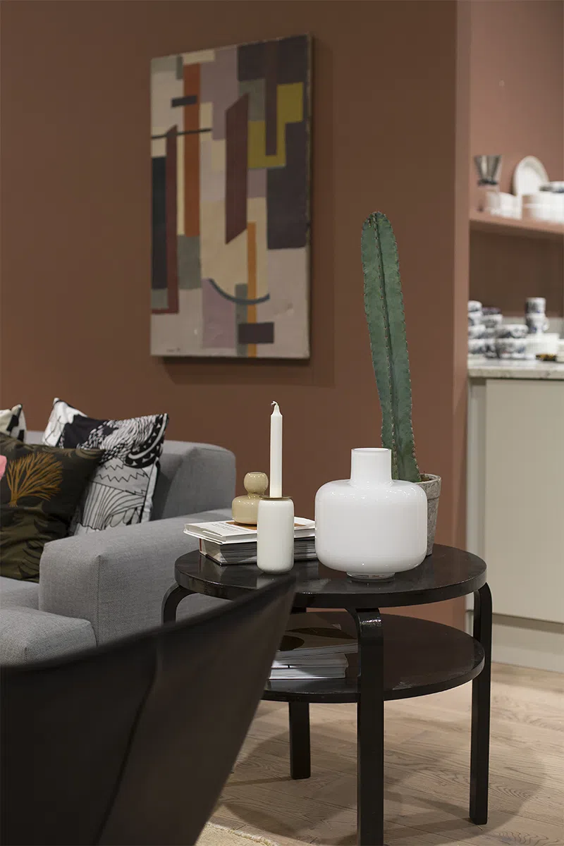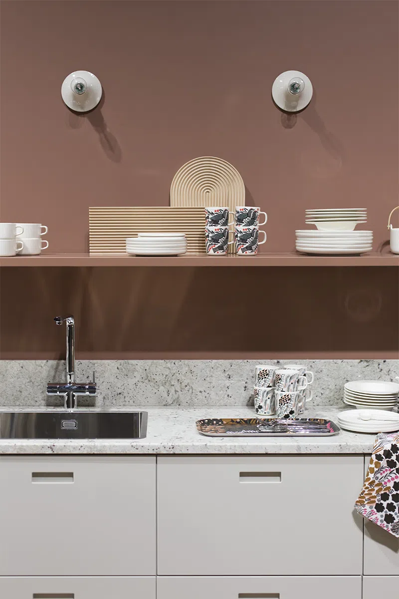 Плотный розовый с оттенком терракоты при теплом освещении. На фотографиях показан в шоу-руме на финской интерьерной выставке с теплым светом в зоне гостиной и с дневным светом в зоне столовой и кухни.